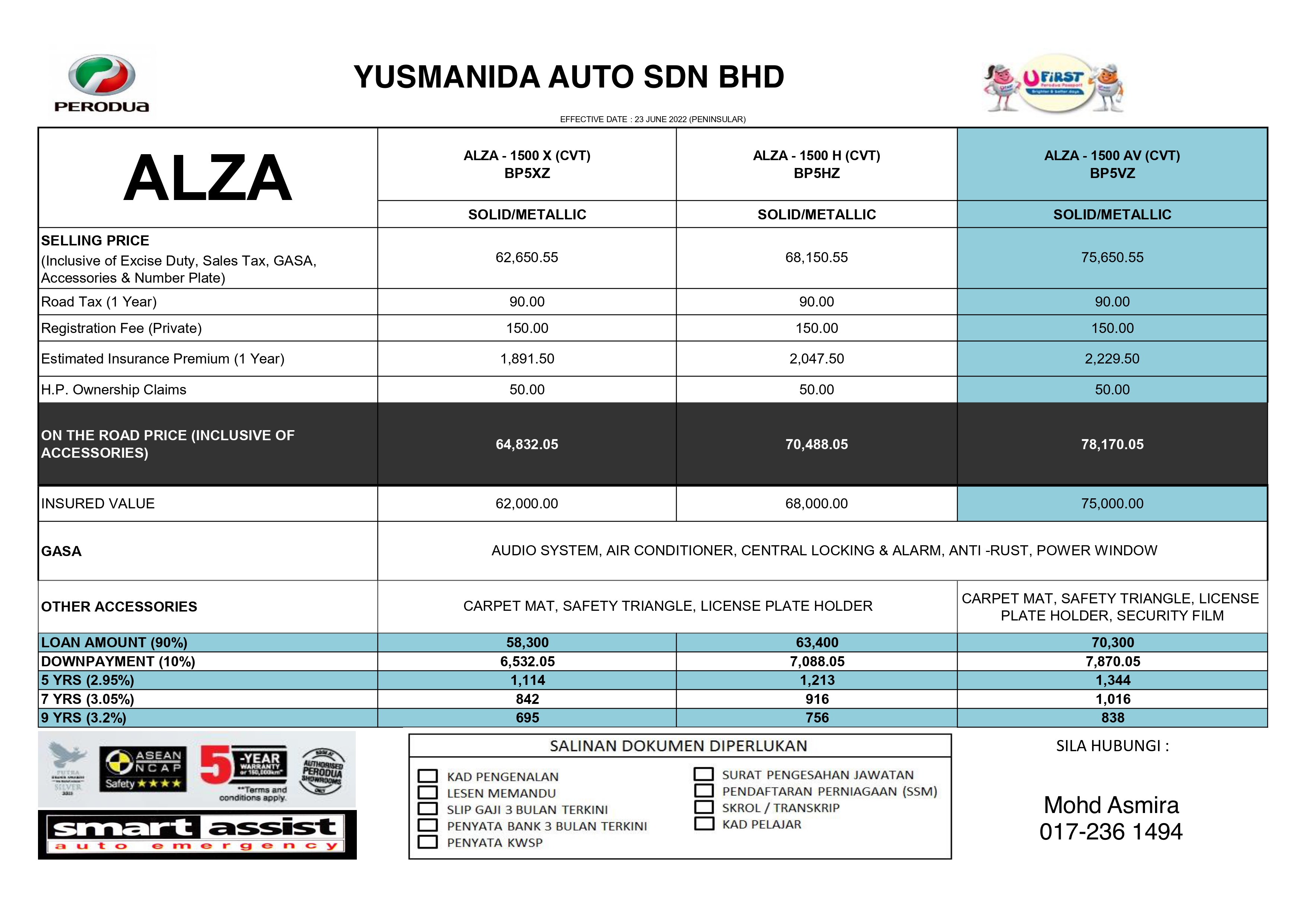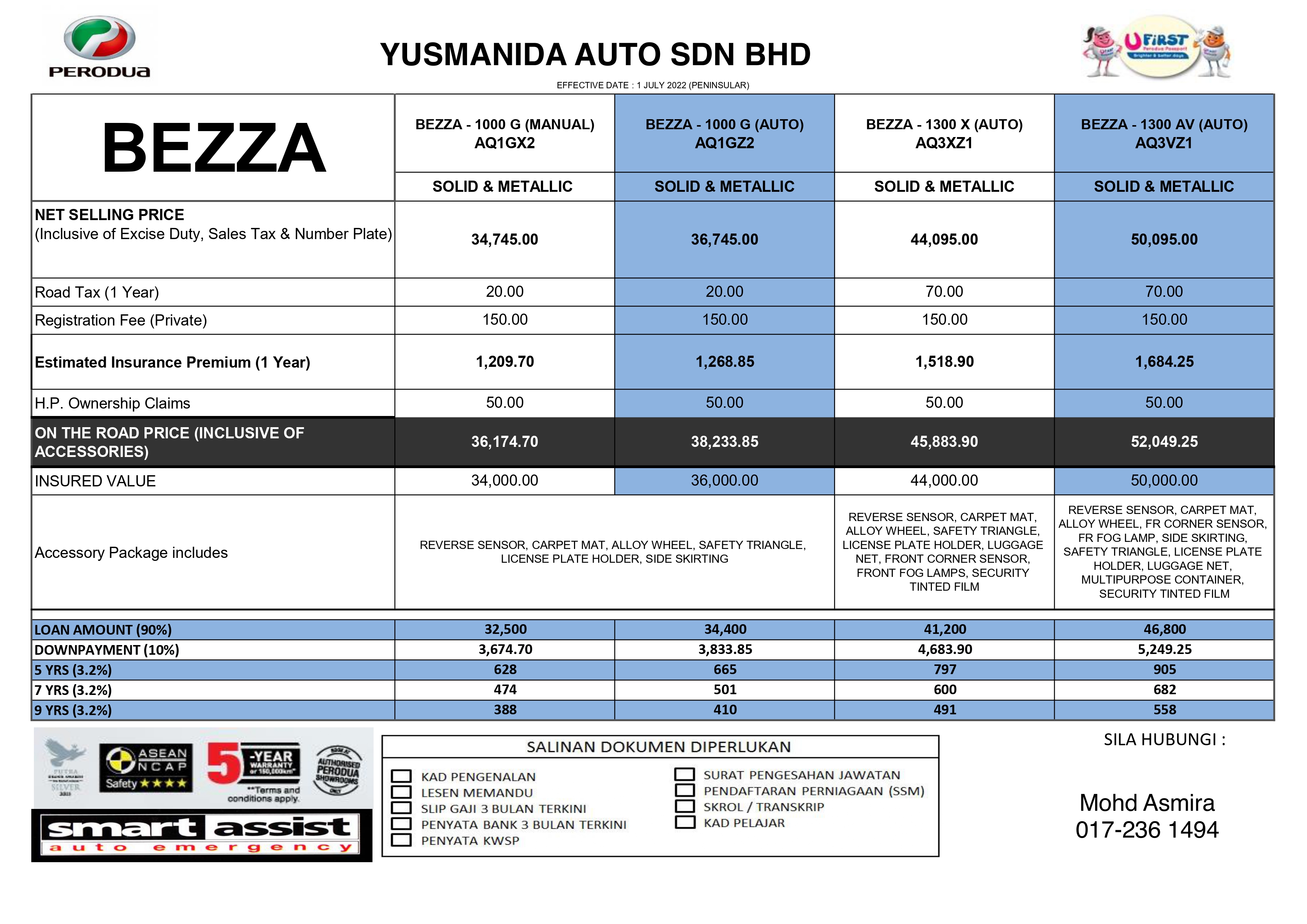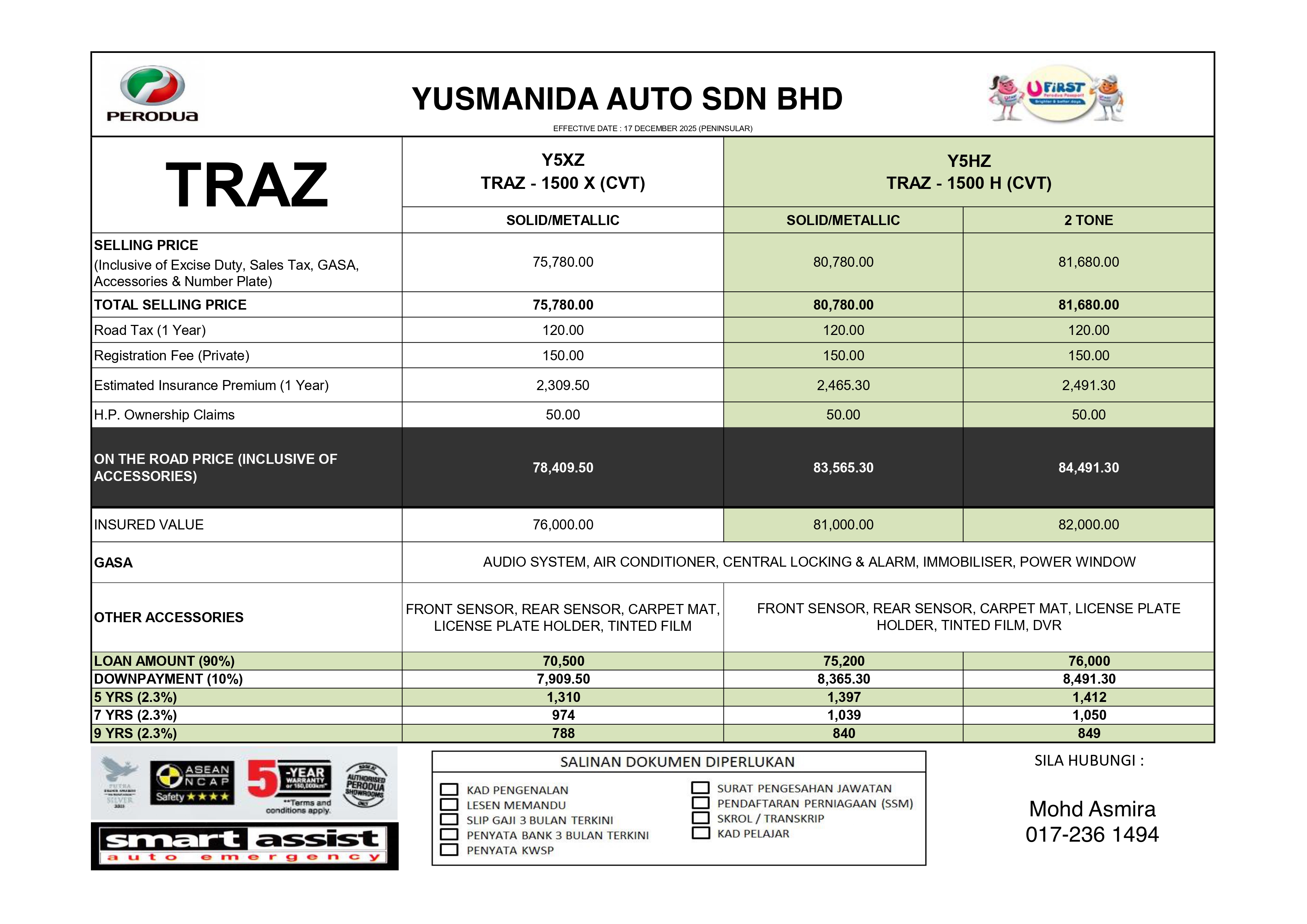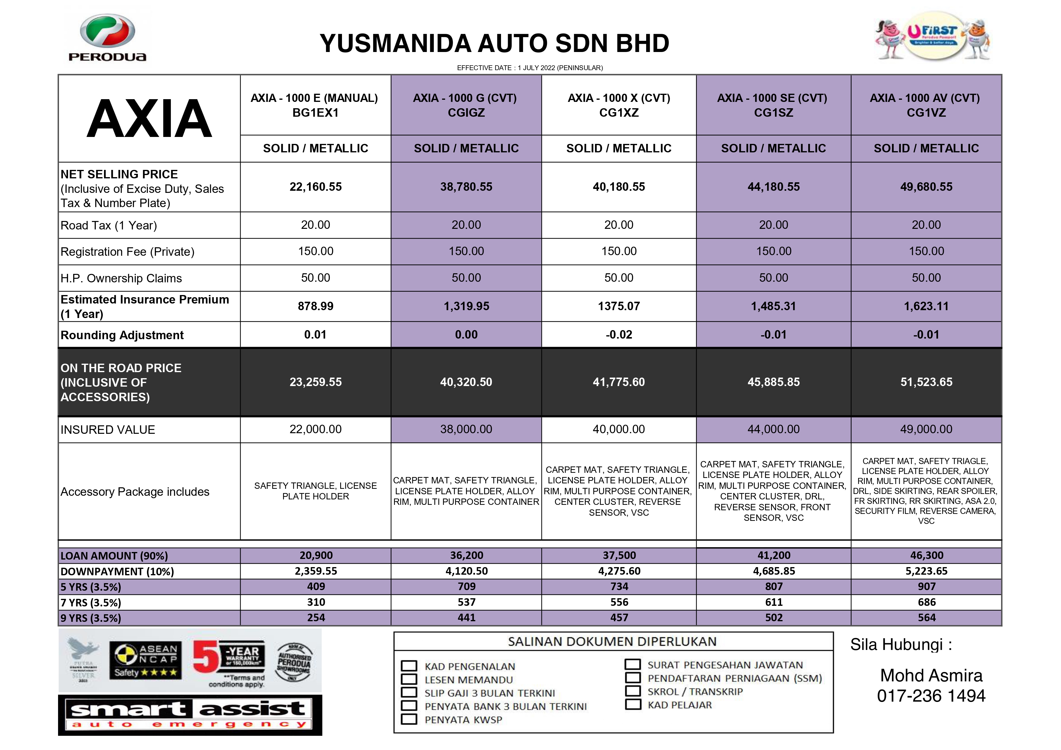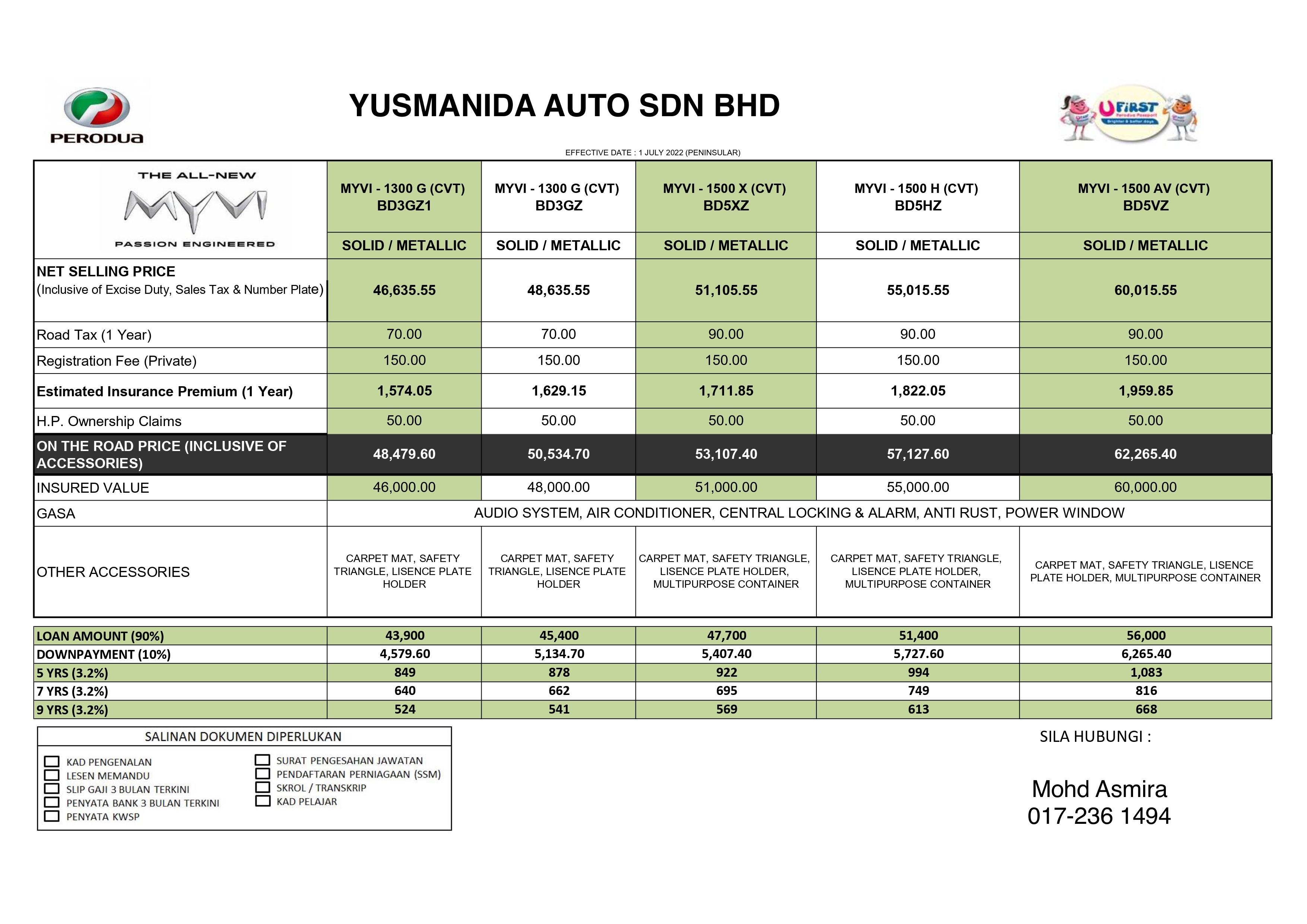 Hubungi En. Asmira Perodua SAUJANA UTAMA – YUSMANIDA AUTO untuk dapatkan maklumat penuh mengenai proses pembelian kereta Perodua baru di SAUJANA UTAMA – YUSMANIDA AUTO.