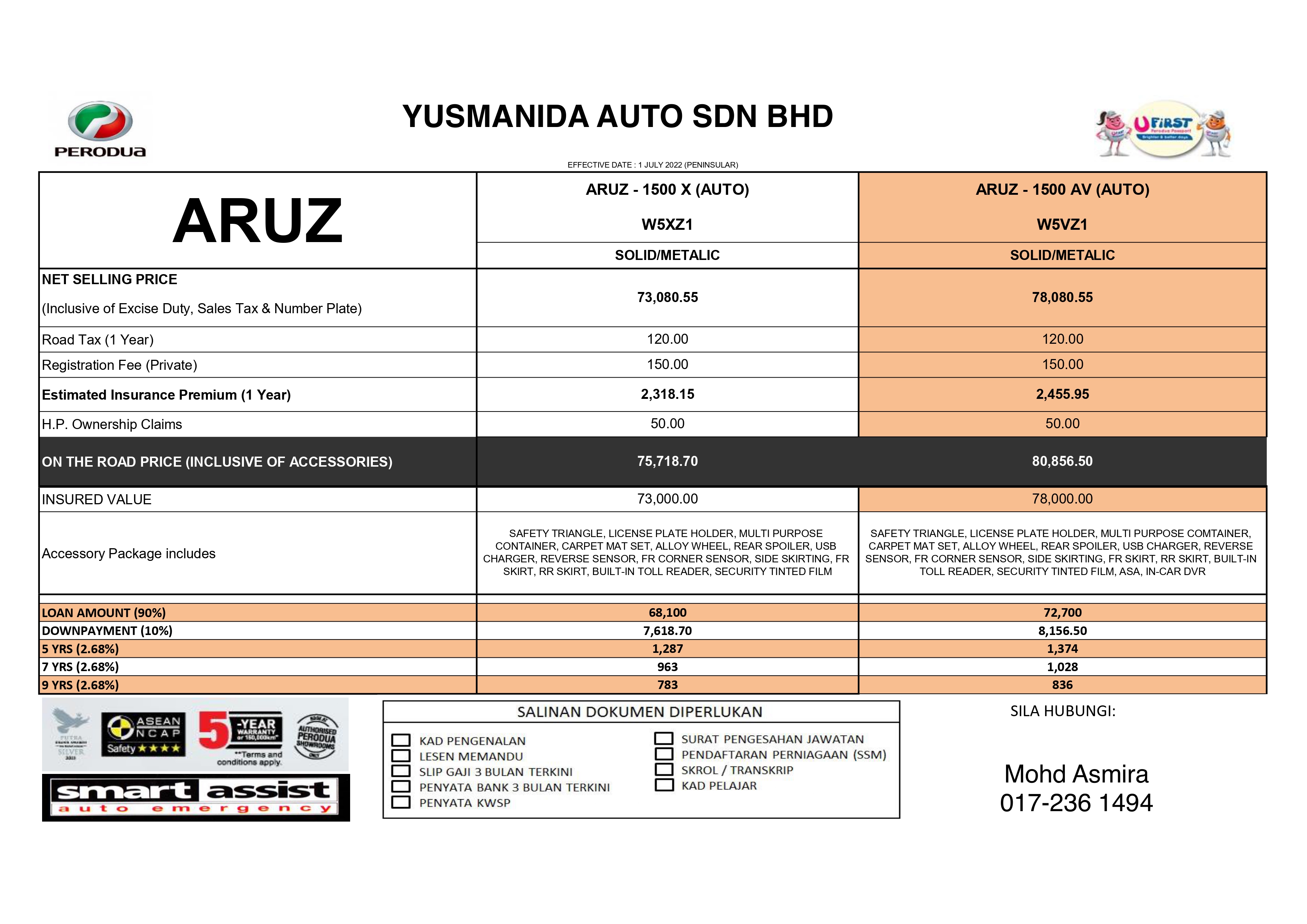 Hai! Nama saya Asmira, Sales Advisor Perodua SAUJANA UTAMA – YUSMANIDA AUTO yang sah dan saya berpengalaman lebih 16 tahun dalam bidang jualan kereta Perodua di Malaysia.